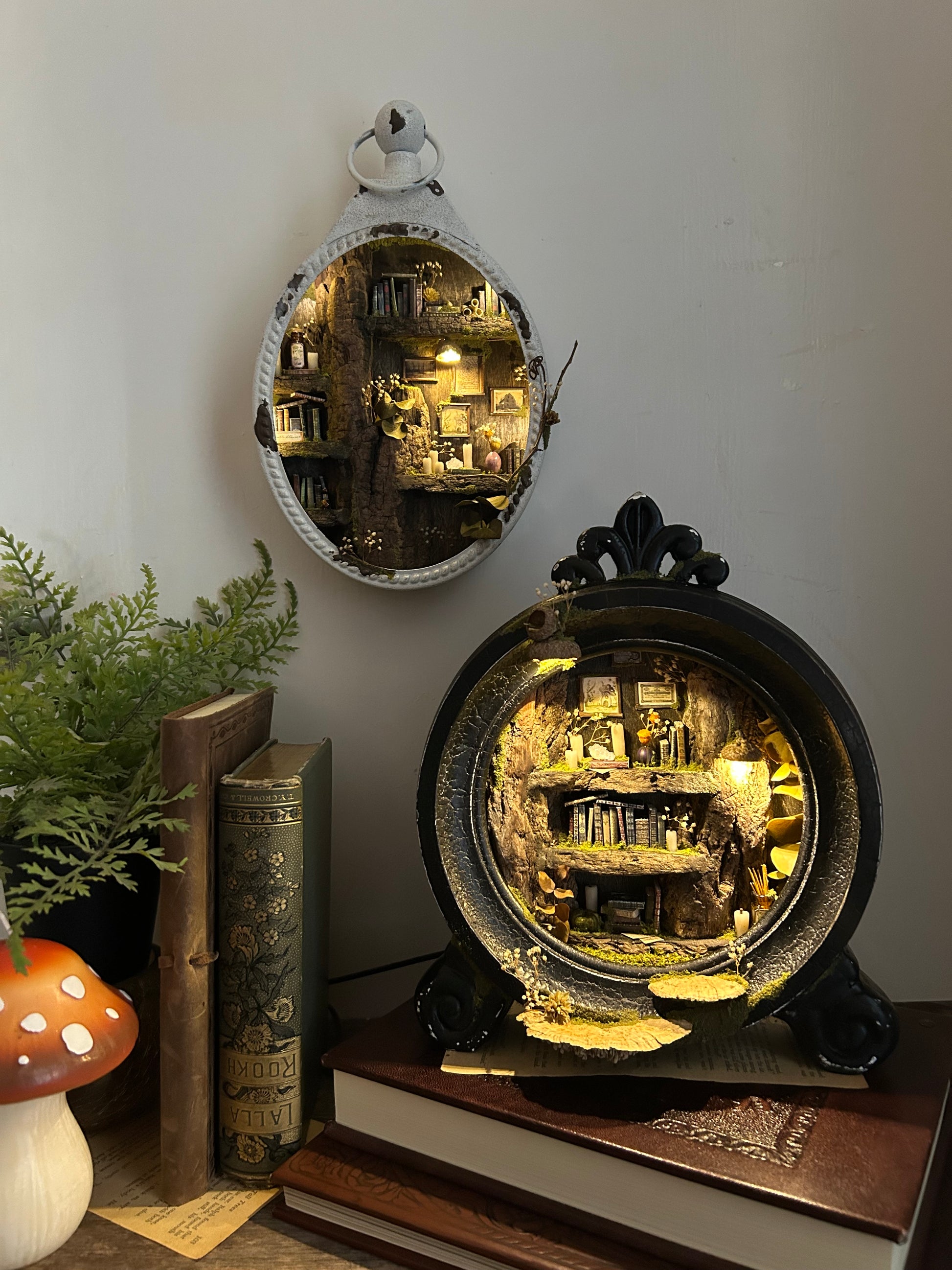 This faery wall hanging is part of our fae clock collection, as this piece in particular was a wall clock that we disassembled and recreated into a cozy fae dwelling. There is no functional clock on this one, but it does make for a very unique wall piece and the perfect cozy lighting! You’ll find lots of details inside, like books and candles, bottles and scrolls, and so much more. Adorned with faux moss and dried florals, it would make a perfect addition to any eclectic gallery wall.