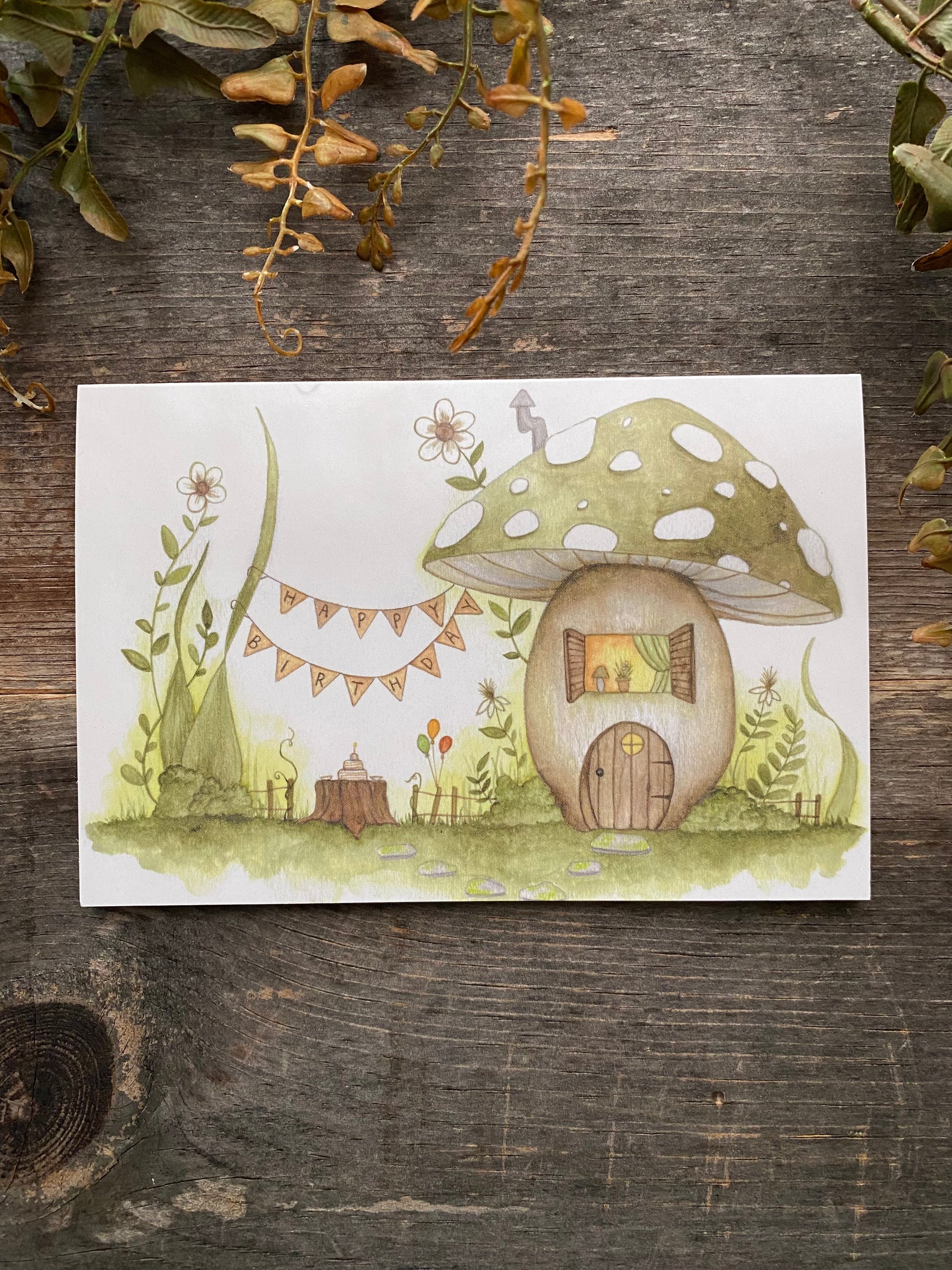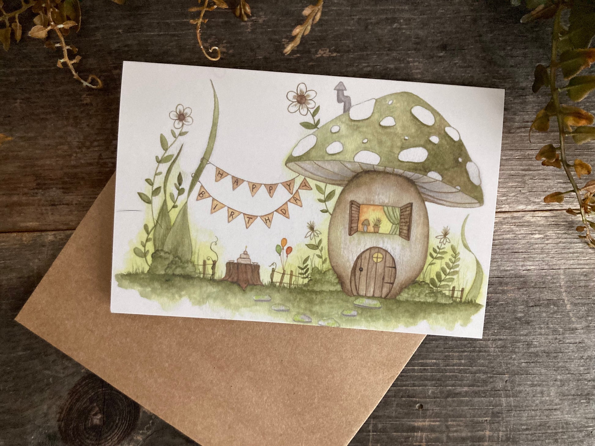 This faery birthday card features an original hand painted image of an adorable fae birthday party :) printed on thick card stock with a glossy finish, it measures 4x6 inches when folded. It will also come with a brown paper envelope. The inside has been left blank to put your own handwritten message.
