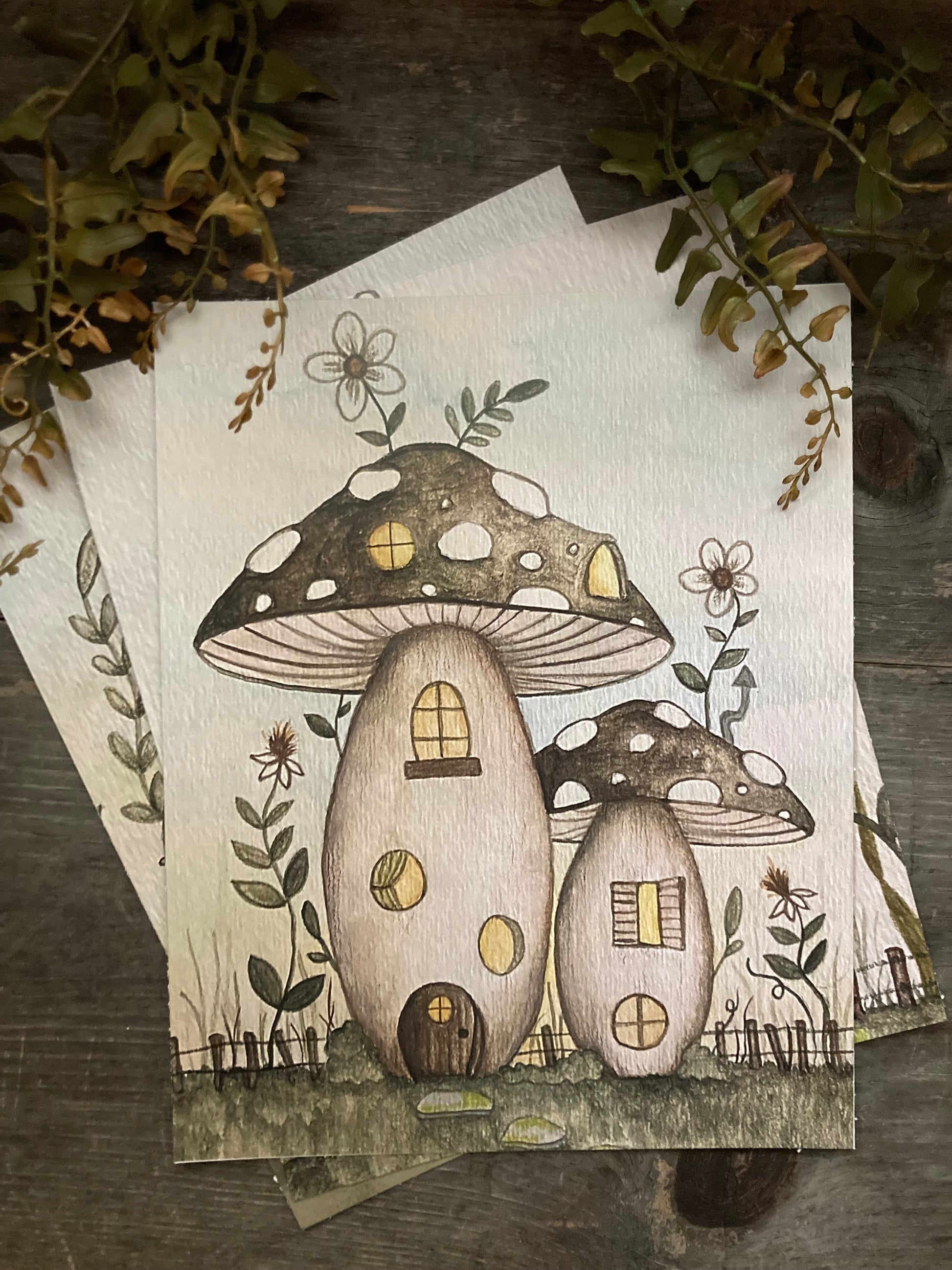 This listing is for one mushroom house art print, approximately 8x10 inches. These are printed on premium quality thick cardstock and have a matte finish. They are prints of my original watercolor paintings, and each one is signed by the artist. These prints are ready to ship and will be sent within 3-5 days after purchase! Your print will ship in a flat, thick cardboard envelope and is protected in a plastic sleeve for the best protection.