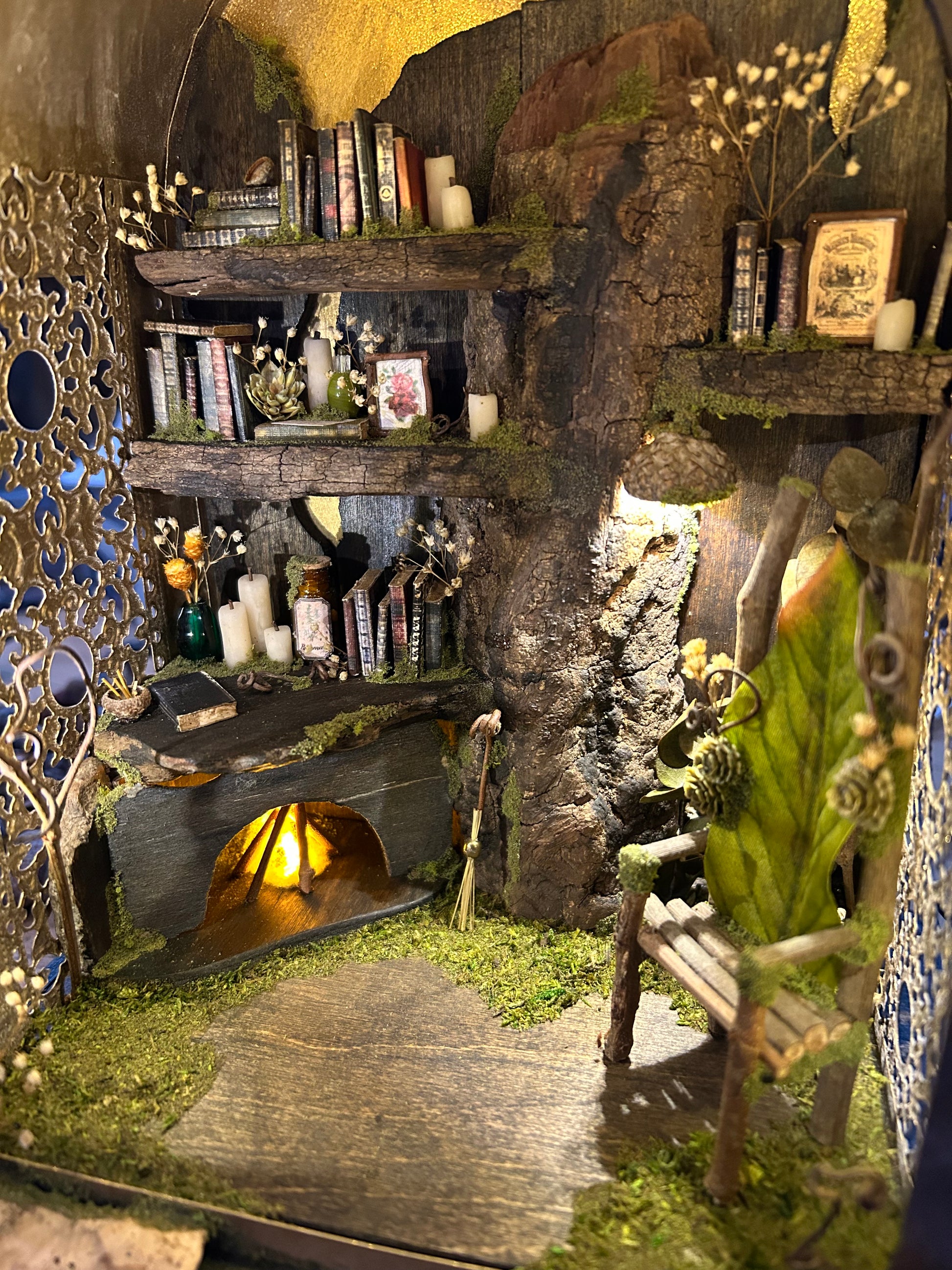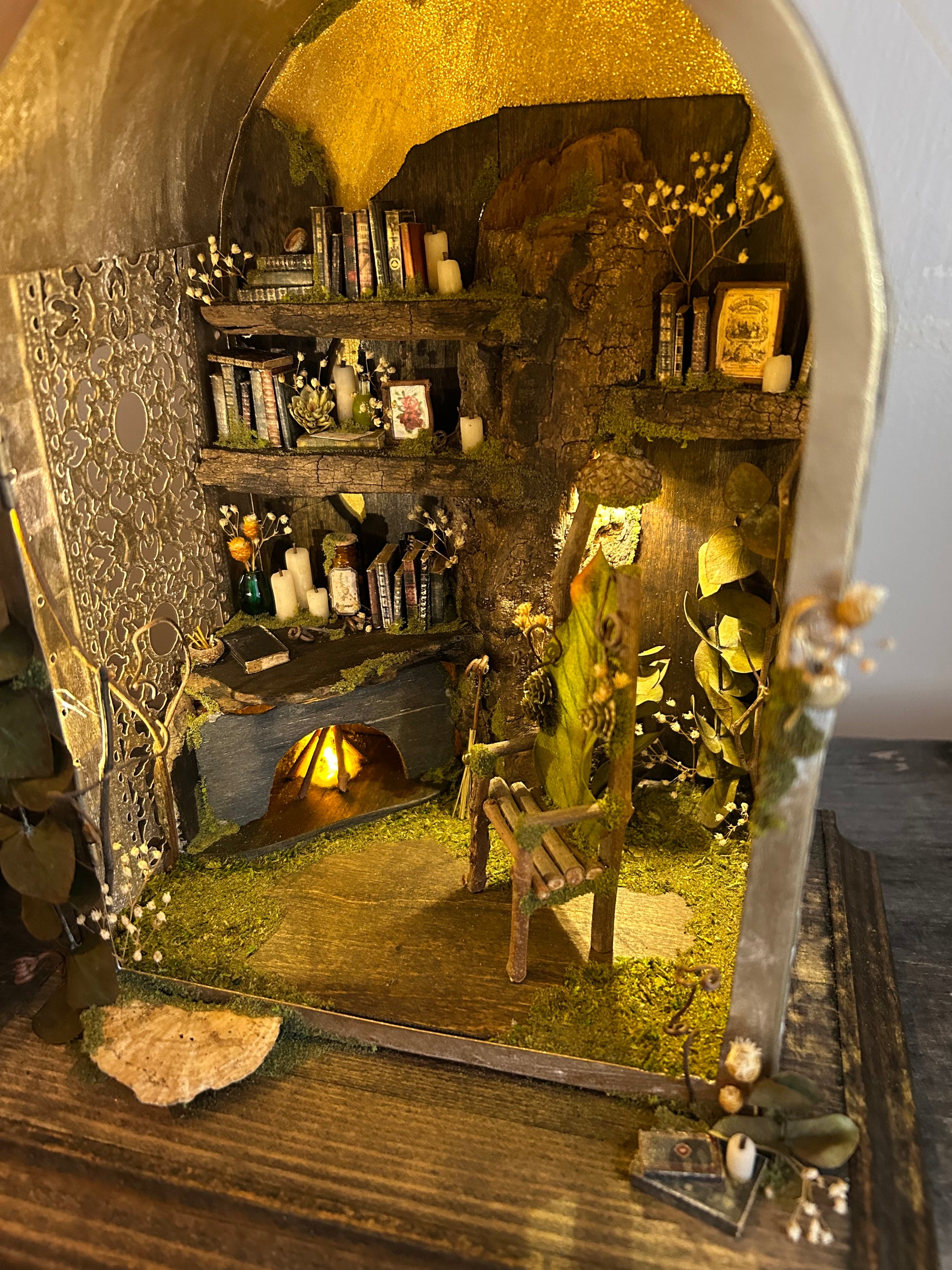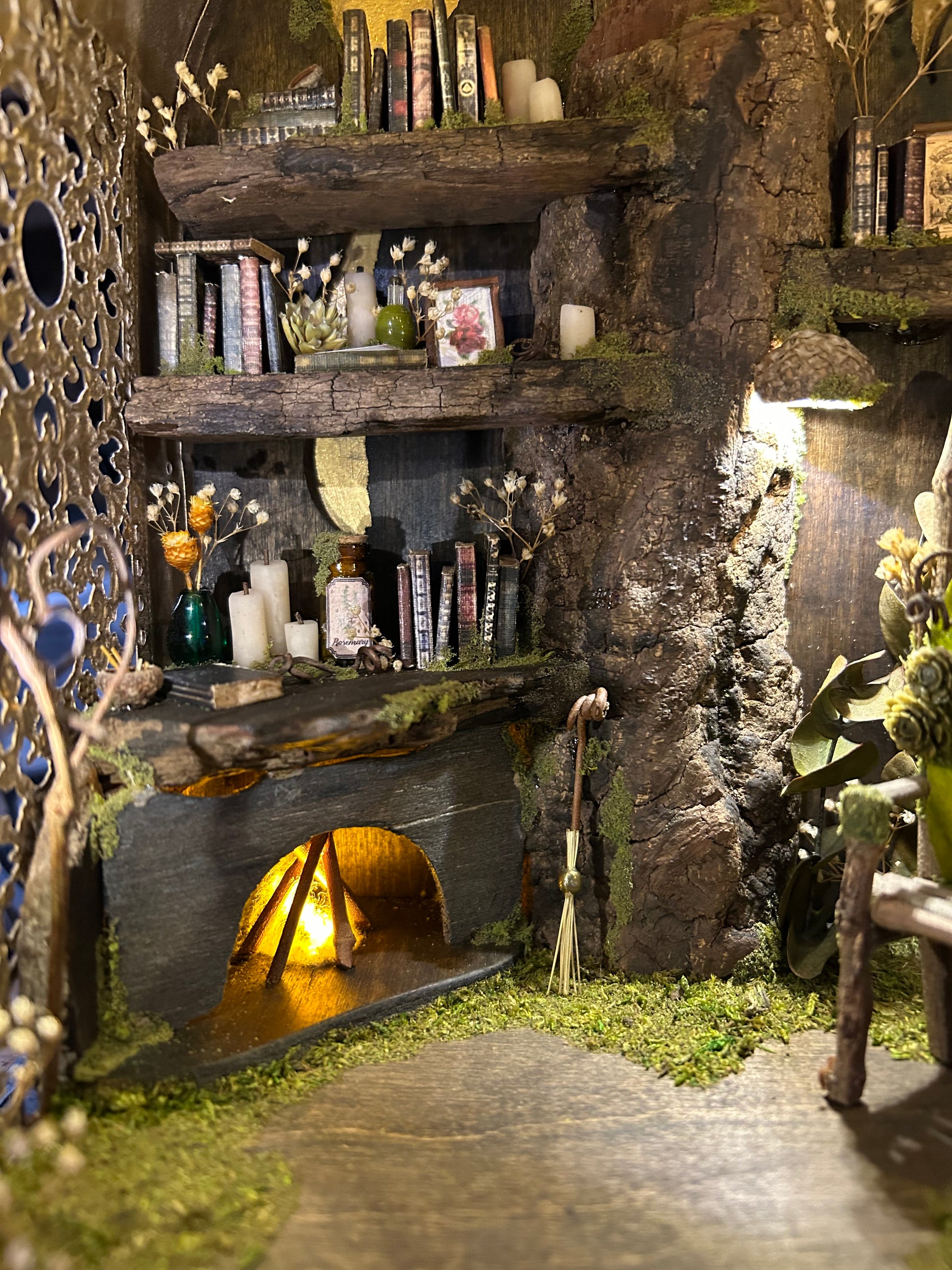 This one of a kind faery lantern has everything to create a warm, cozy, ambient light for any room. Any faery would love to crawl inside and enjoy a book next to the flickering fireplace :) There are lots of details in this one and everything is handmade - the little books, candles, jars, photos, and the driftwood shelving it all sits on. Adorned with dried florals and leaves, it is truly a perfectly natural space for any little faery. Lovingly created with attention to detail and carefully wired for the lighting, the craftsmanship in this lantern will be noticed by anyone who sees it.