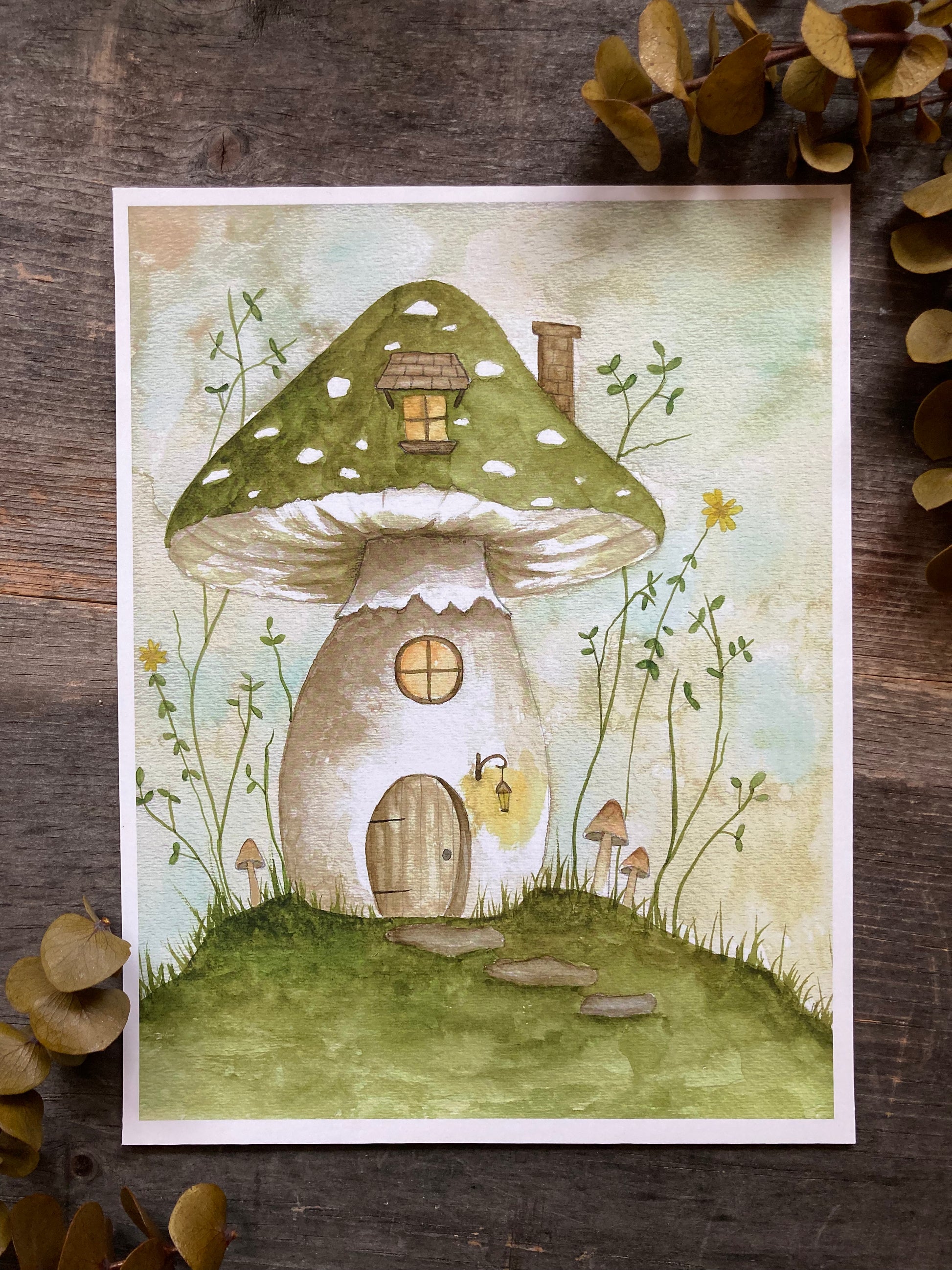 This listing is for one mushroom house art print. Available sizes are 8x10 or 5x7 inches. Please note these sizes are approximate and may vary slightly. These are printed on premium quality thick cardstock and have a matte finish. They are prints of my original watercolor paintings, and each one is signed by the artist. These prints are ready to ship and will be sent within 3-5 days after purchase! Your print will ship in a flat, thick cardboard envelope and is protected in a plastic sleeve for the best protection.