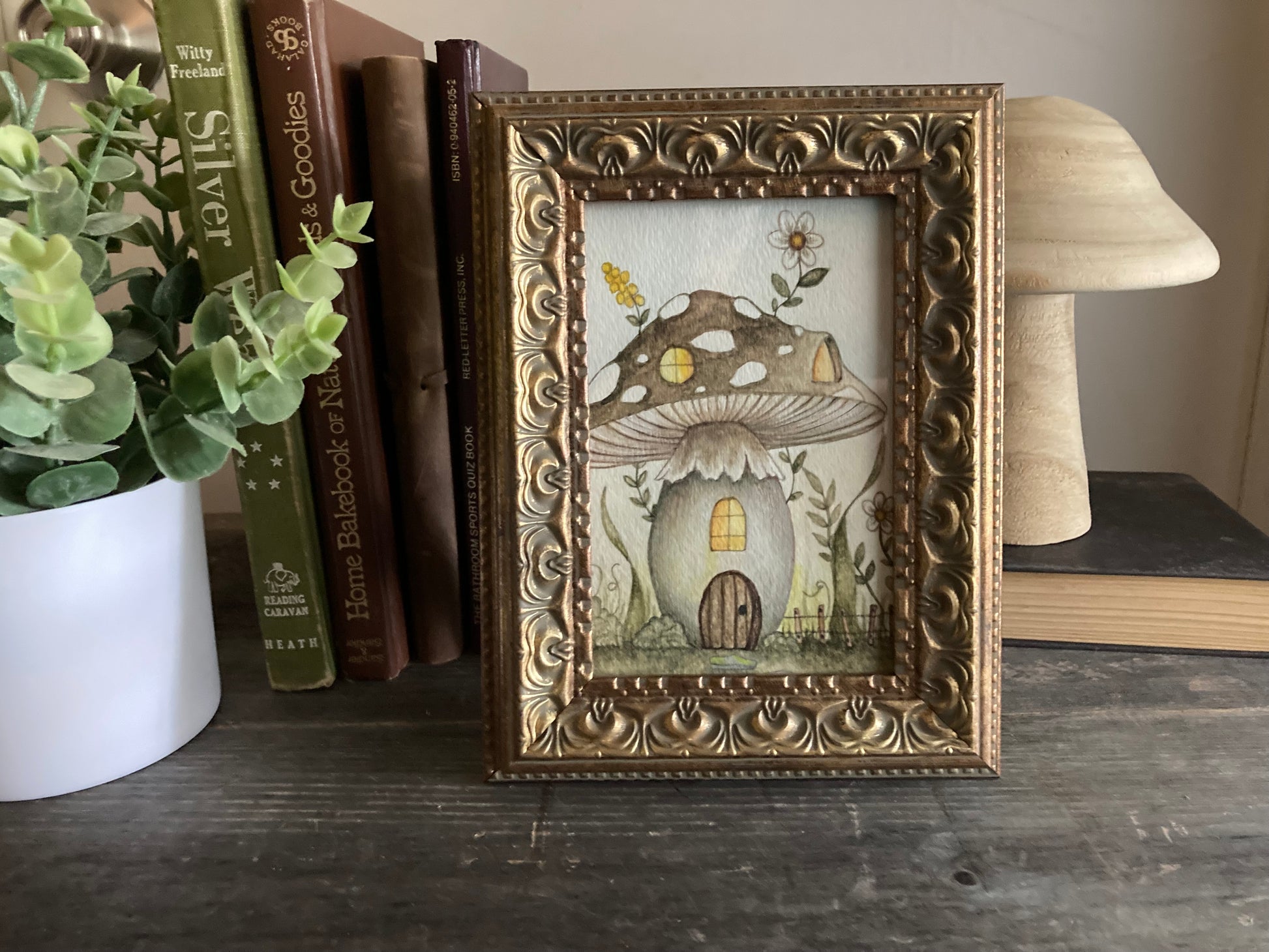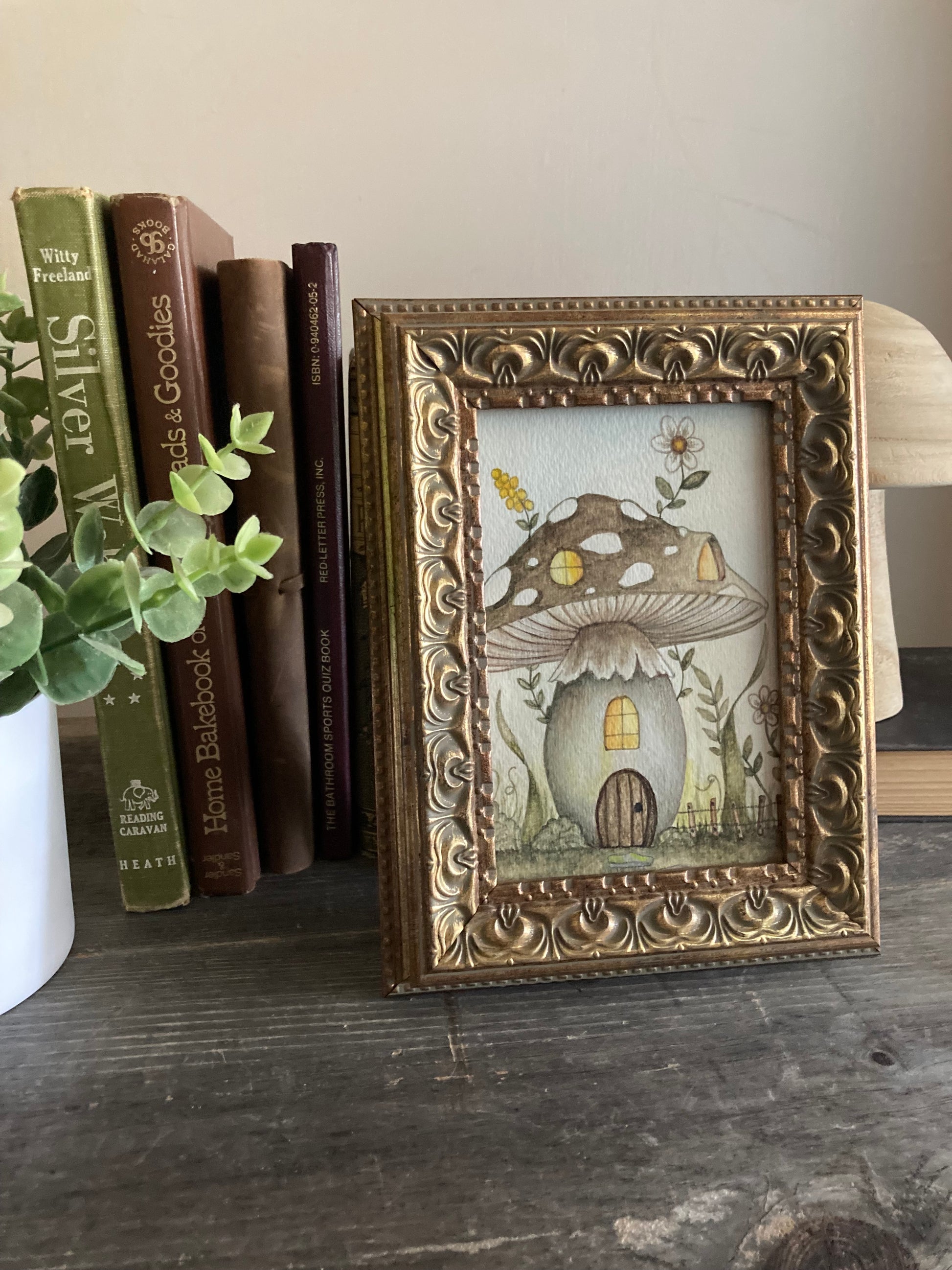 This is an original painting (gouache and watercolor) on thick watercolor paper, and it comes in the frame. An adorable faery dwelling / mushroom house surrounded by flowers and greenery, and a picket fence. Would make a lovely gift for any faery lover, or kept for yourself! :) The back is signed and dated by the artist.